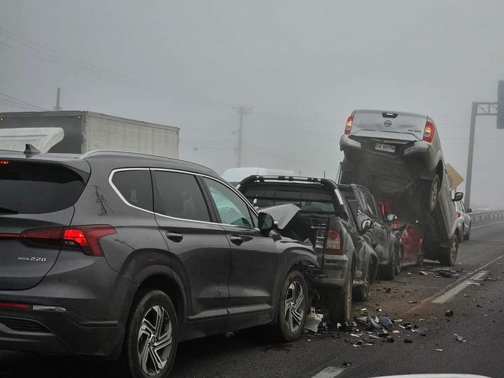 El accidente en cadena ocurrió pasadas las 9 de la mañana en el kilómetro 103 de la Ruta 5 Sur, pista oriente y tuvo como participantes a cinco vehículos menores, entre ellos una camioneta que quedó sobre uno de los automóviles.