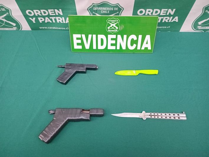 Durante una fiscalización preventiva desarrollada por carabineros de la Primera Comisaría en el sector de Parque Lauca en la comuna de San Fernando, fueron detenidos tres menores de edad, acusados por porte ilegal de dos armas de fuego tipo pistola de fabricación artesanal adaptadas para el disparo, y dos armas blancas.
