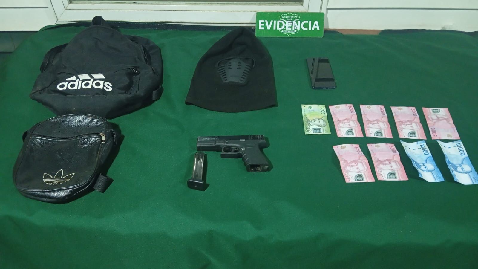 Con esos antecedentes, los efectivos policiales activaron de inmediato el procedimiento en busca de los individuos, logrando la detención de uno de ellos, identificado como M.A.B.Y., chileno, 25 años, sin antecedentes policiales. Al mismo tiempo, se incautaron entre sus pertenencias 1 arma de fantasía tipo pistola con un cargador sin munición; y, se recuperó el dinero sustraído.